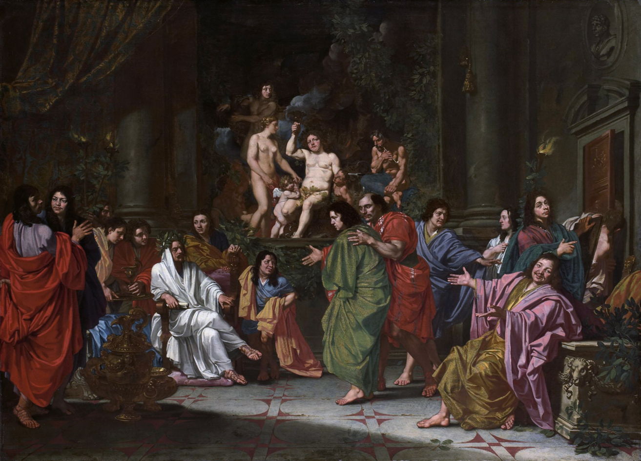 Astrologer Observing the Equinox and a Scene of Parting Adonis and Venus is probably one of his earlier works from this period, and shows a curious combination of an astrologer (not astronomer) at the left, who is studying celestial charts, with the mythical lovers Venus and Adonis, at the right. In front of the couple is a muscular male with transparent wings, who might be a rather different form of cupid.