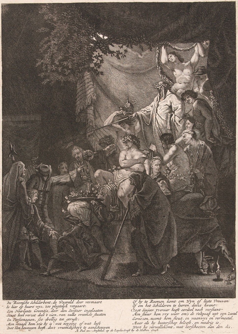 Van Wijnen probably painted his initiation into the Bentvueghels, which was later turned into this engraving by Matthijs Pool. It was, by all accounts, a rowdy and thoroughly Bacchic procedure, also shown by an anonymous artist, below.