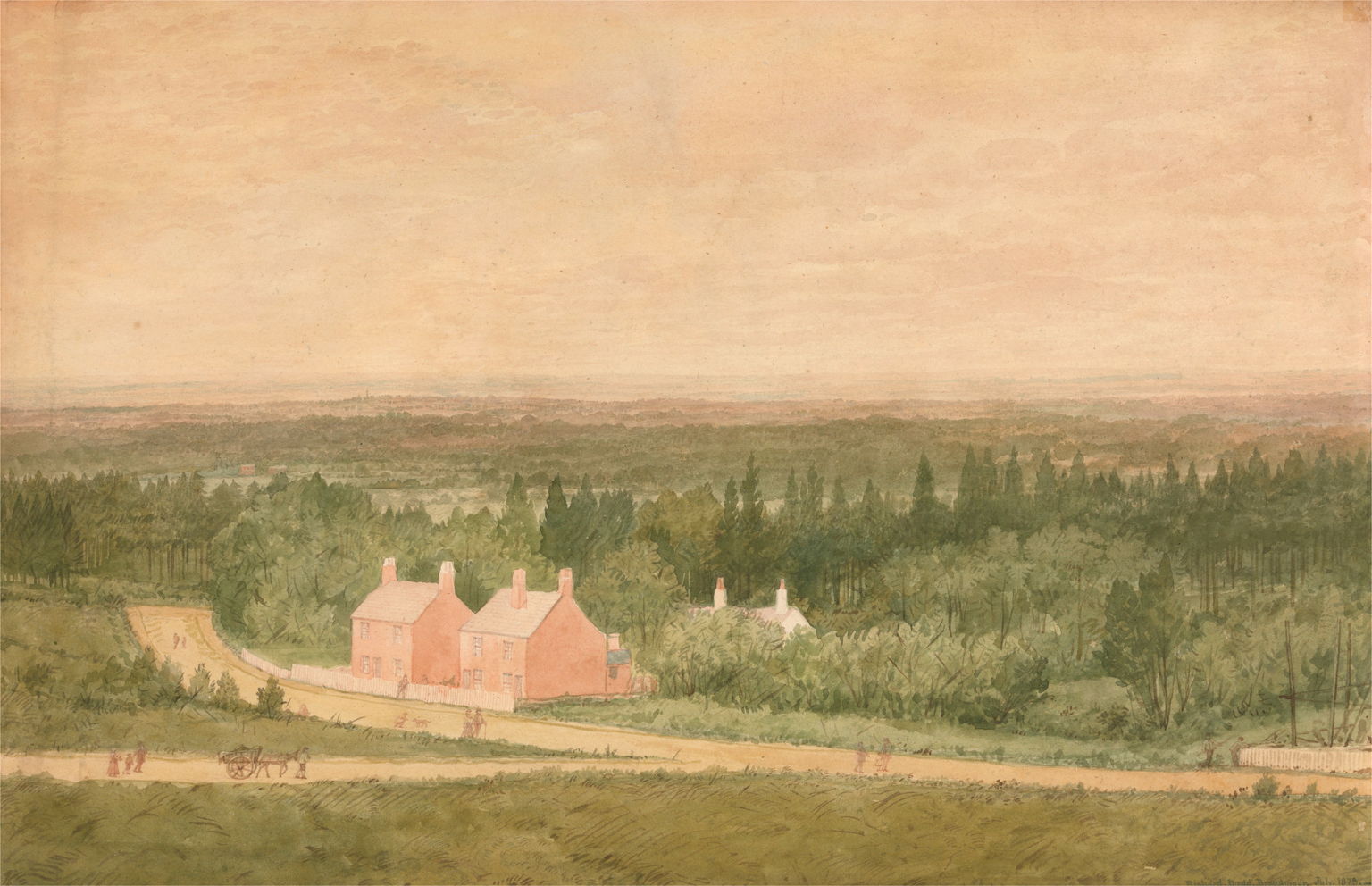 Dadd’s watercolour view of Landscape with Cottages, Broadmoor from 1873 is probably the only landscape painting which he made from the motif, since he had returned from his travels in Europe and the Middle East. It shows the featureless wooded plain which then surrounded the Broadmoor site.