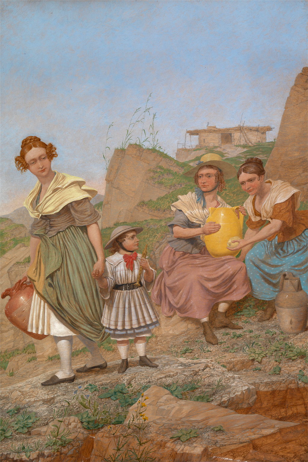 Minor apparently had a copy of Theocritus’ poems in English translation, to which Dadd would have had access. In that volume, the Seventh Idyll describes a shepherd on the Greek island of Kos, which may explain the crook being held by the man, and this unusual setting. Dadd made a watercolour copy of this painting, which he inscribed with the title Italian Rustic Musicians.