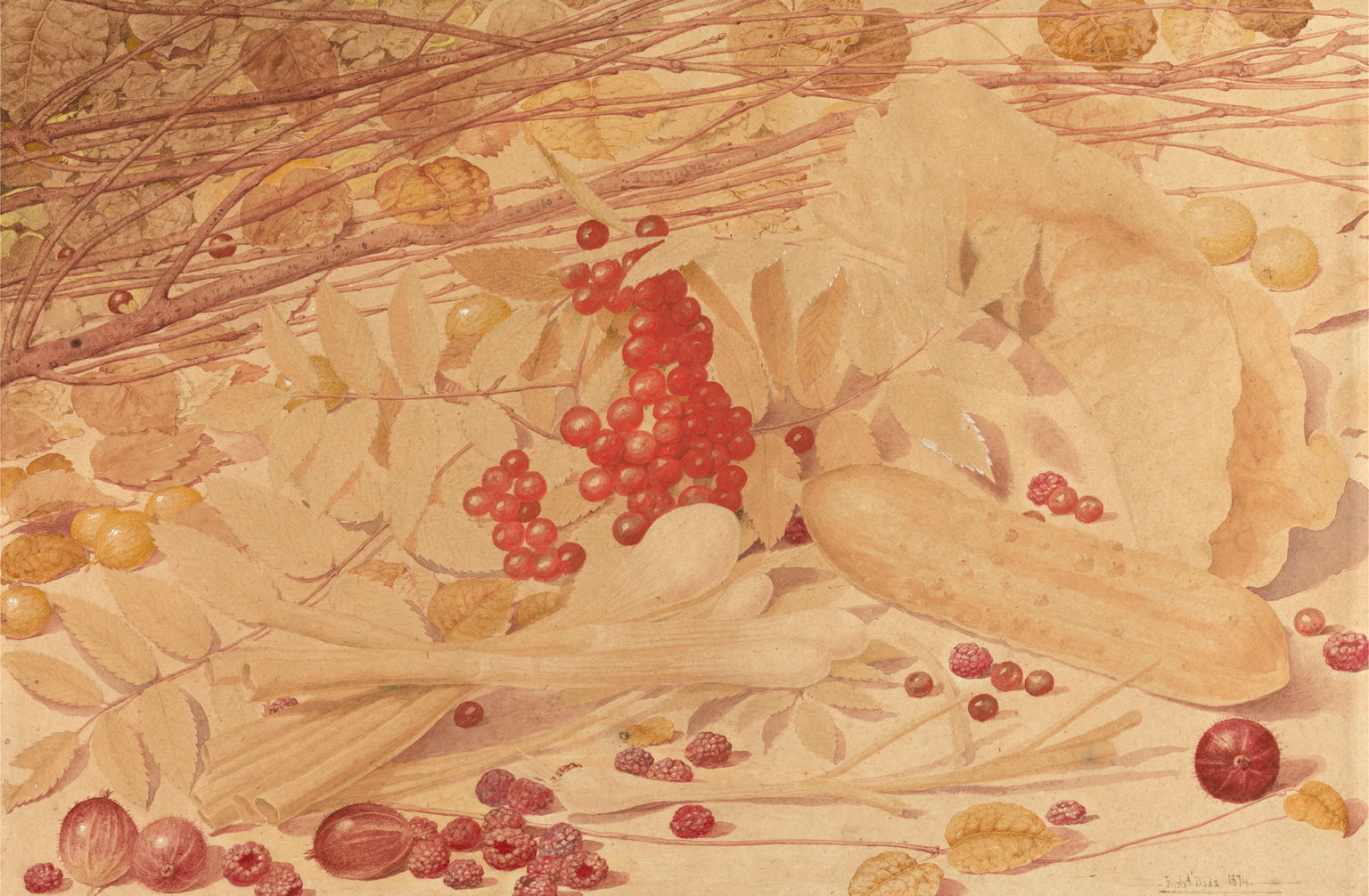 Situated in the country, Broadmoor grew its own produce in a twelve acre kitchen garden, and Dadd’s watercolour Still Life with Gooseberries, Raspberries, Red Currants, Spring Onions, a Gherkin and Foliage, from 1874, would have been painted from some of that produce.