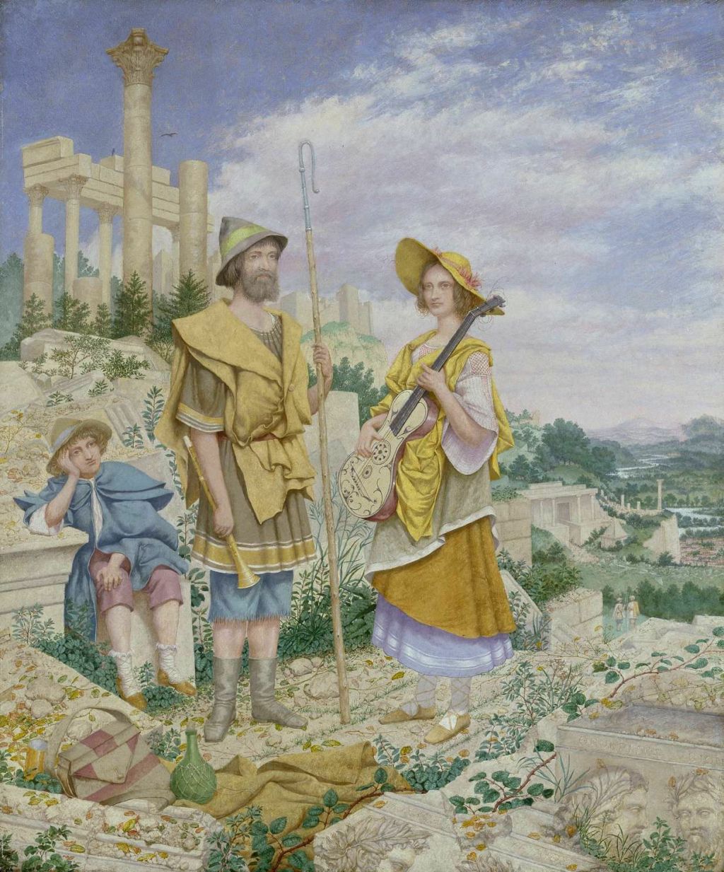 Wandering Musicians, from about 1878, is believed to have been Dadd’s last oil painting. It shows an itinerant couple and their son among gently overgrown ruins of a classical building, above a town most probably in the Mediterranean. The two musicians are intended to be pifferari, typically Italians who wandered from festival to festival as a lifestyle, playing distinctive folk music. JWM Turner had earlier painted pifferari, in his Modern Italy – the Pifferari (1838).