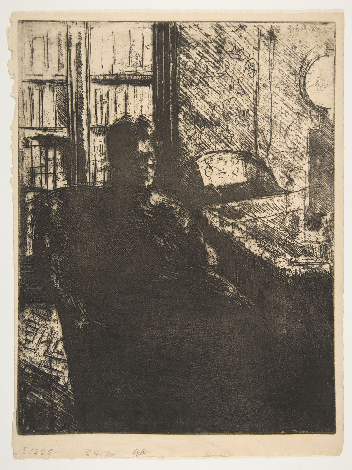 Cassatt’s first prints are often very dark and dense, as shown in her soft-ground of a woman Knitting in the Glow of a Lamp (c 1880).