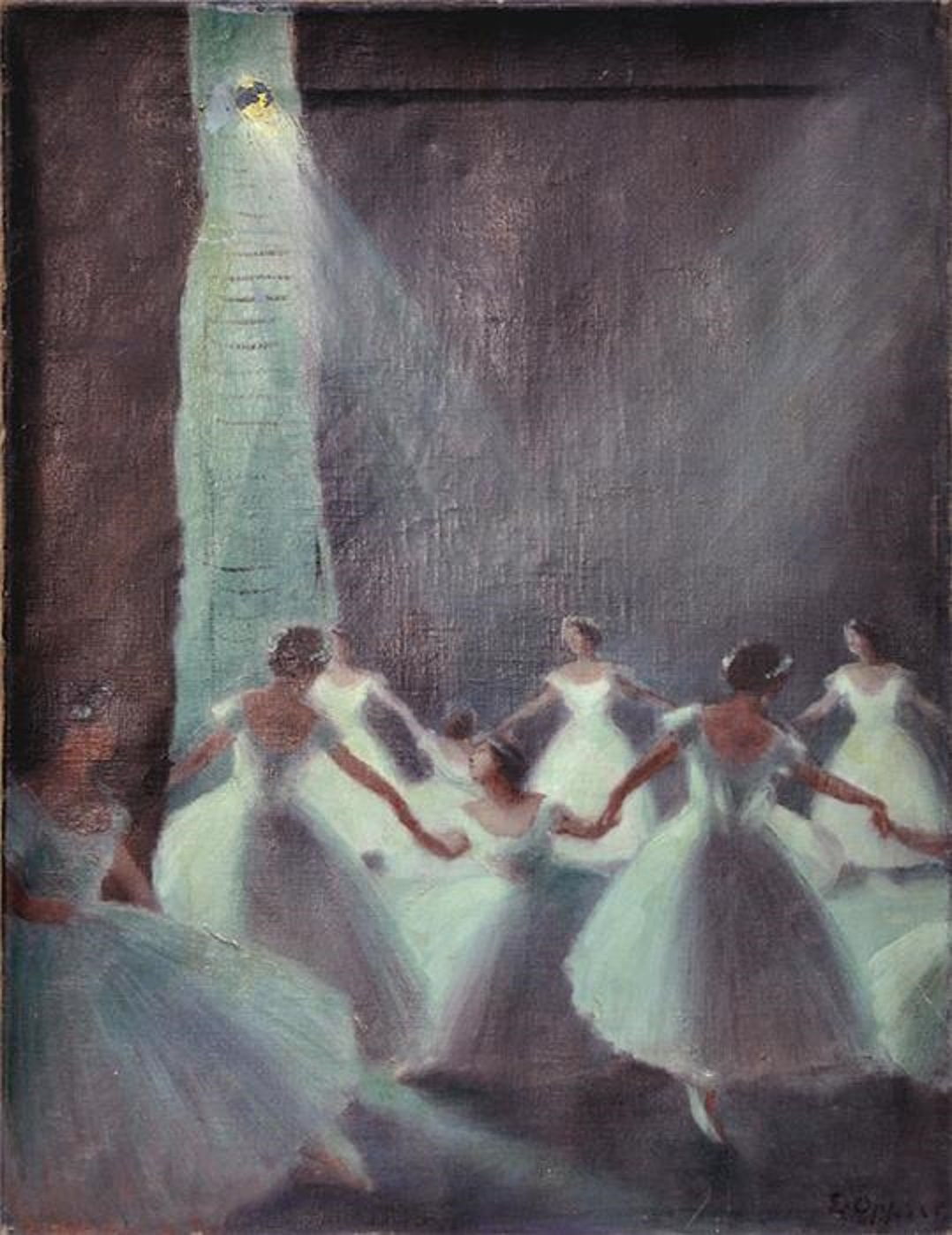 Ernst Oppler, a German Impressionist and contemporary of Lovis Corinth, painted a couple of similar views in the wings of Les Sylphides (1915), above, and Ballet Scene (1915), below. He also made some prints of dancers.