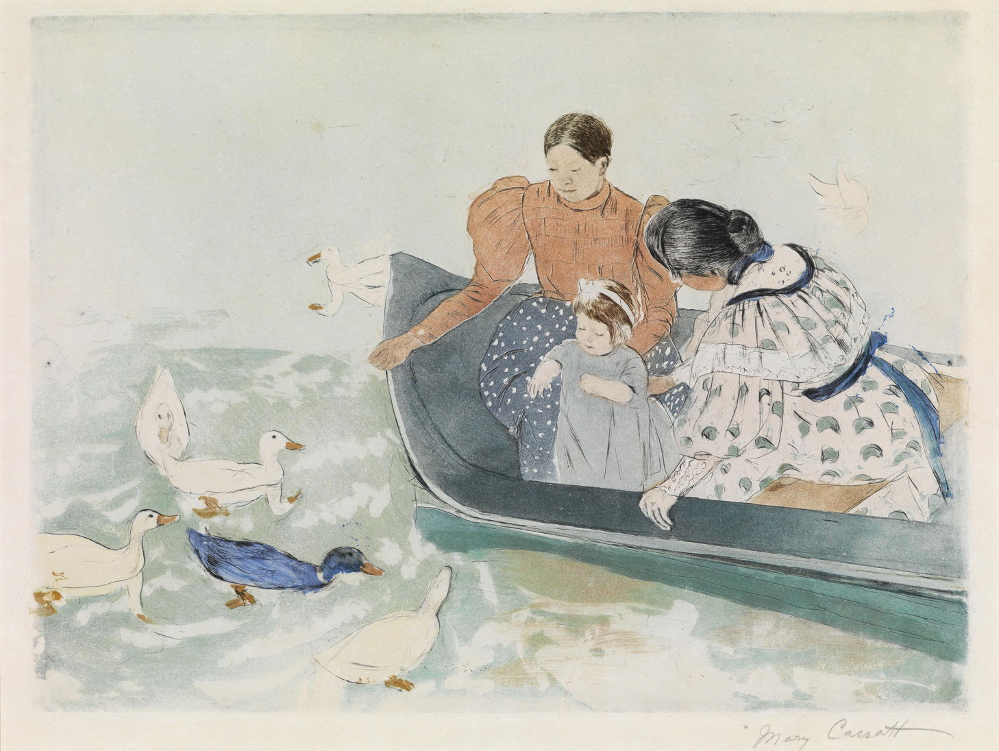 Cassatt had not stopped painting in oils, but concentrated more on portraits and scenes of motherhood and families, such as this very loose painting of a mother and daughter feeding ducks from a boat in Summertime (1894). I believe this was the source for another sophisticated print, called perhaps more appropriately Feeding the Ducks (c 1894), below.