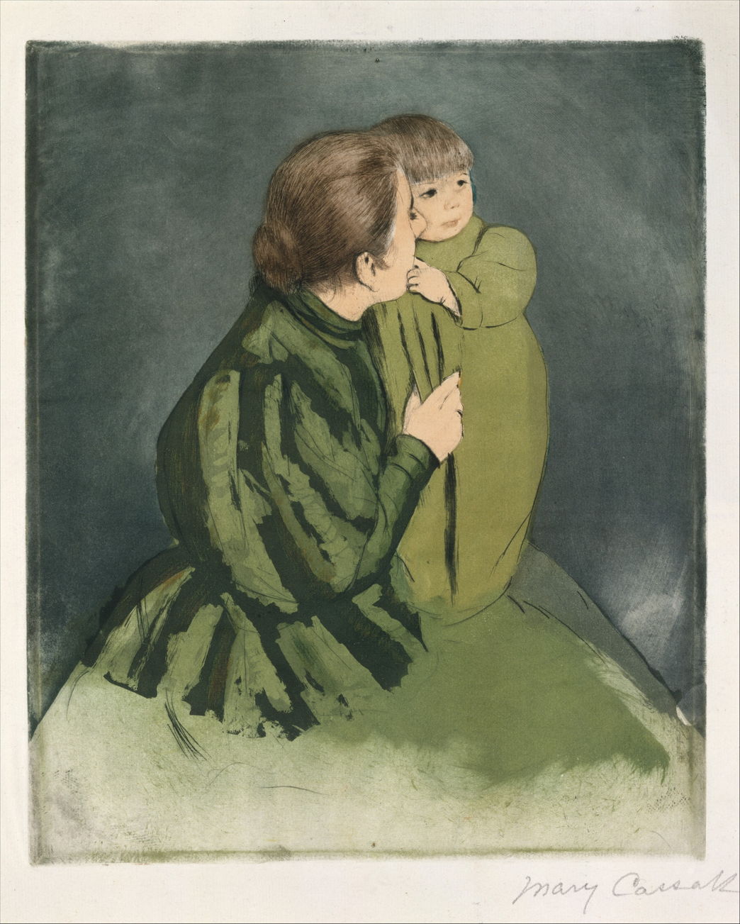 During the mid-1880s, Cassatt moved away from Impressionism, and concentrated on simpler work with emphasis on line and form. In her print-making, she seems to have worked hardest on developing her drypoint technique, and combining it with subsequent methods for incorporating colour.
