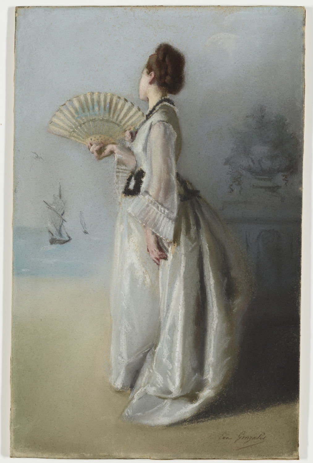 Eva Gonzalès (1849–1883), one of the four major women Impressionists, shows the increasing emphasis on marks in her Lady with a Fan (c 1869-70).