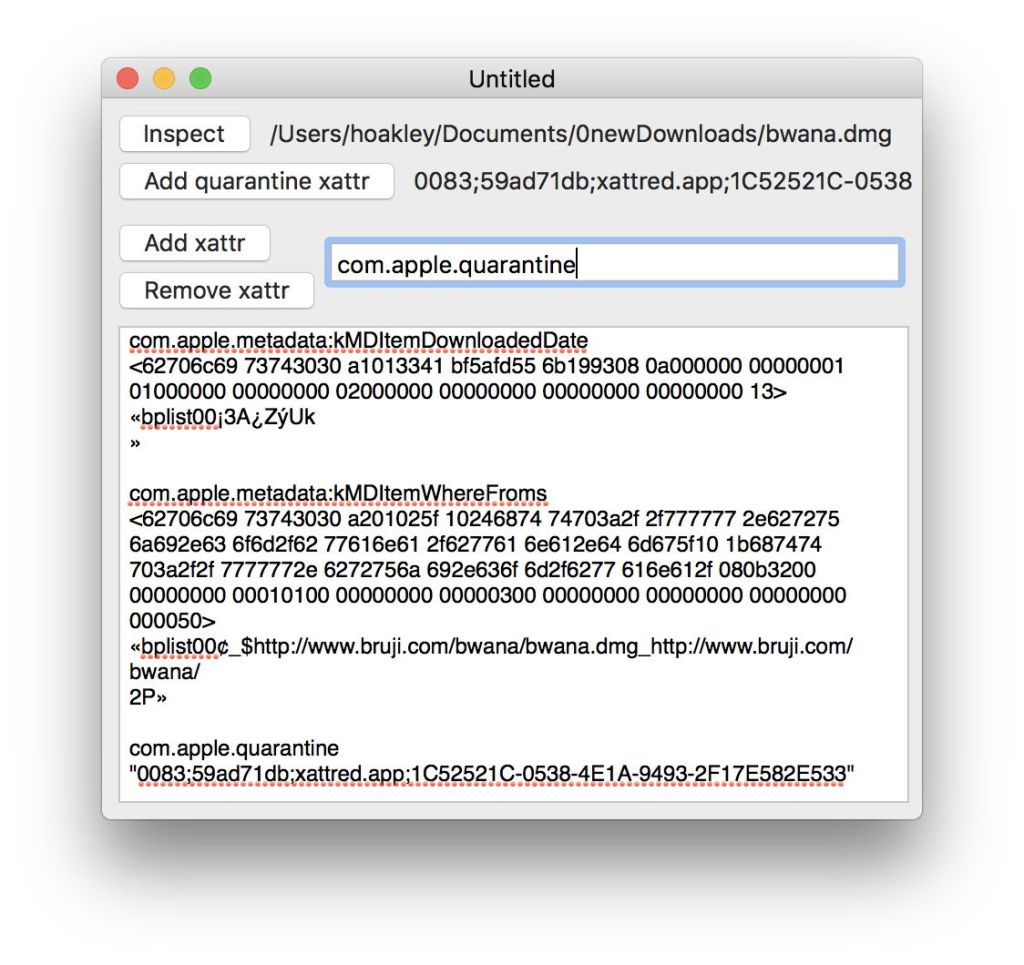 The most complex action is that for the Inspect button. After handling the selection of the file/folder to be inspected, a string array containing the list of xattrs is obtained using listExtendedAttributes(). That array is iterated through to obtain each of the xattrs using the call extendedAttribute(), which returns the contents of the named xattr as Data.