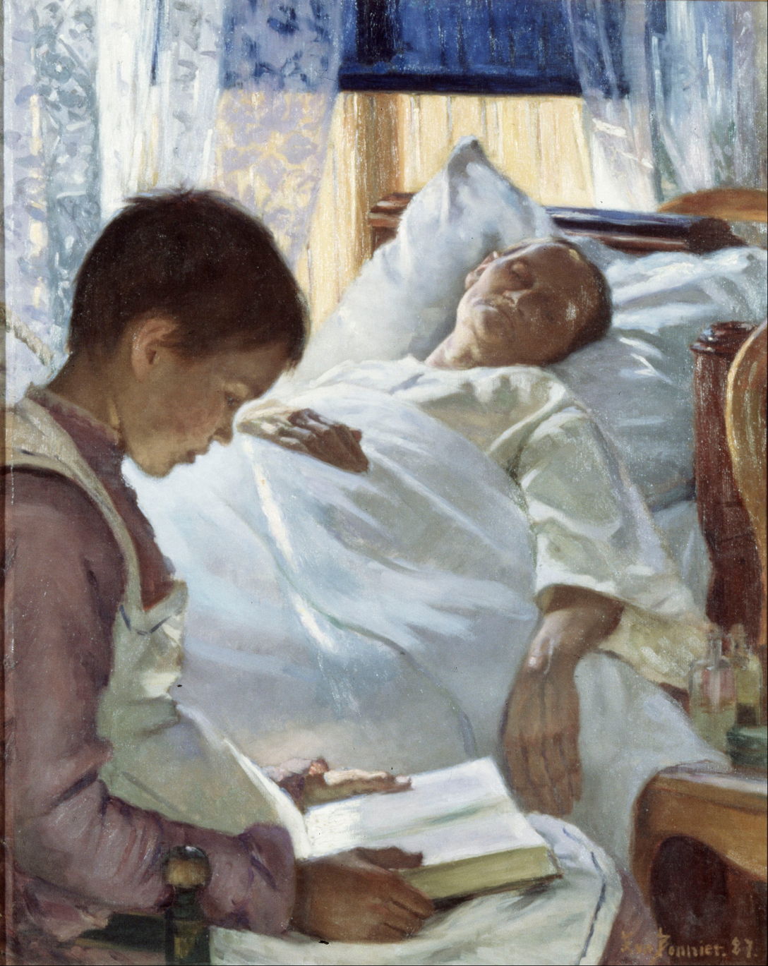 Reflection in Blue (1887) is one a series of portraits which she painted of friends and relatives during their sickness and convalescence, which include her sister-in-law Lisen in 1890. In each, brightly-lit white bed linen contrasts with the frail condition of the subject.