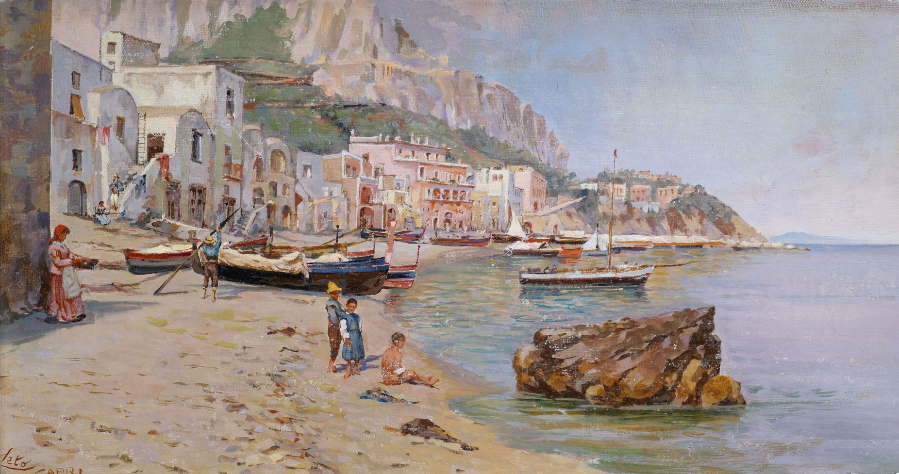 Antonino Leto’s undated view of Capri was most probably painted after he had retired to the island in 1882, following his career of painting landscapes and genre views in Impressionist style. I think that this shows the Marina Grande on the north coast, viewed from the east. Leto was originally inspired by the work of Giuseppe De Nittis, and in 1879 joined him and the group of Italian Impressionists who had gathered in Paris.