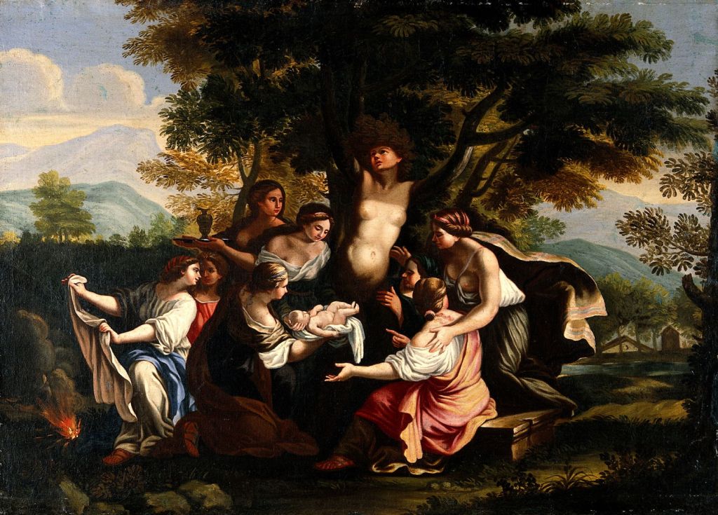 Over a century later, this wonderful panel showing The Birth of Adonis and Transformation of Myrrha was painted, possibly after Luigi Garzi, although again its maker is disputed. Reference to Myrrha’s dark past has been concealed, and she is here shown as a chimera between woman and tree, with the infant Adonis just delivered by a large team of midwives and maids.