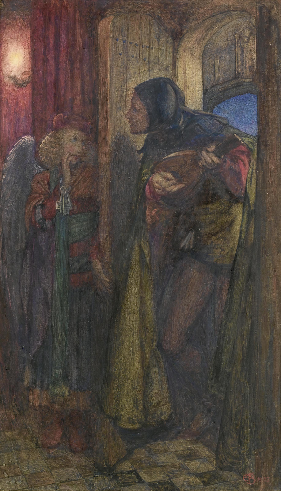 The Poet (1903) is a watercolour showing a minstrel singing to a winged female angel, who is carrying a bunch of keys.