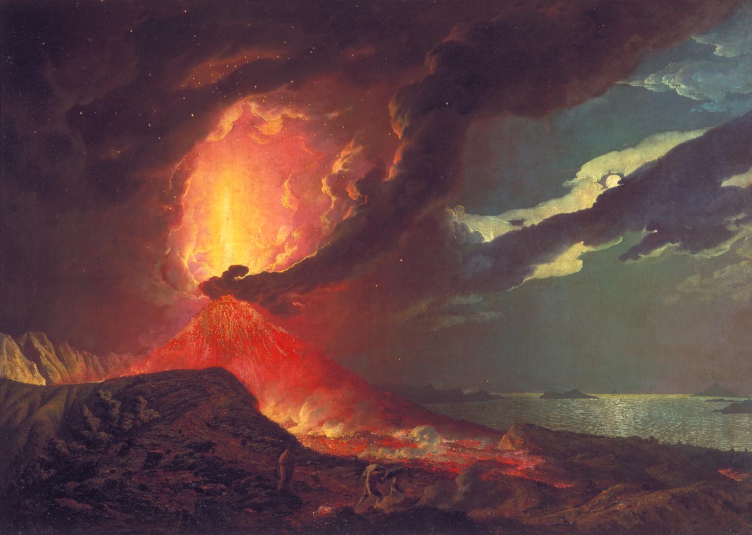 Pierre-Jacques Volaire was a French landscape artist, a pupil of Vernet, who moved to Rome in 1762, and on to Naples five years later. His painting of Eruption of Vesuvius on 14 May 1771 (c 1771) is one of a series which he made covering eruptions from 1767 to 1782. He was also more innovative in his choice of view: here he has approached the lava flows and looks west across the Bay of Naples. This brings the moon into view, and provides contrasting colours.