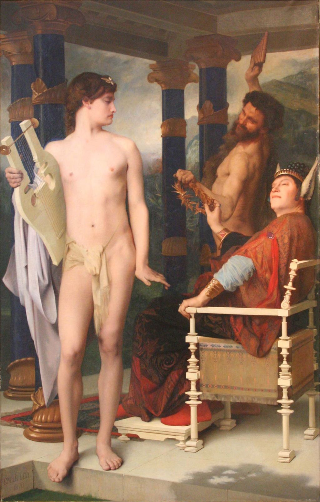 Émile Lévy’s painting of The Judgement of Midas was completed in 1870, and is as clean and uncluttered as Crane’s later illustration. Apollo stands in disdain, in a position which would appear seriously homoerotic. Seated, with his ass’s ears and a facile smile all over his face is King Midas, who is passing a gold laurel crown – a reference to his earlier golden touch – to Pan, who holds his pipes aloft in victory.