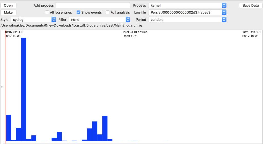 When using Woodpile, you should first look at patterns over time, as I have shown above, and then home into more unusual activity, or periods of high log activity, using Command-click to zoom in and obtain a log excerpt.