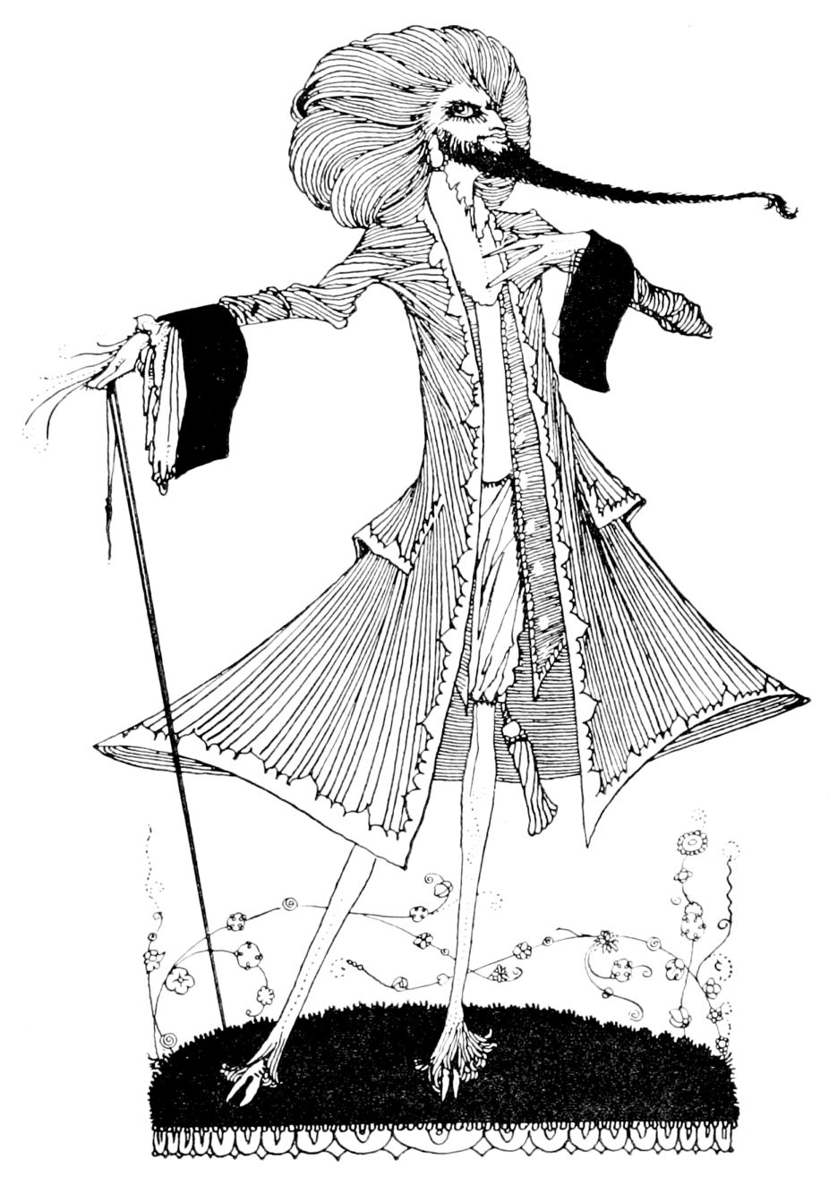 I have two illustrations made by Harry Clarke, who seems to have been an admirer of Aubrey Beardley’s style, with even sharper elements of caricature.