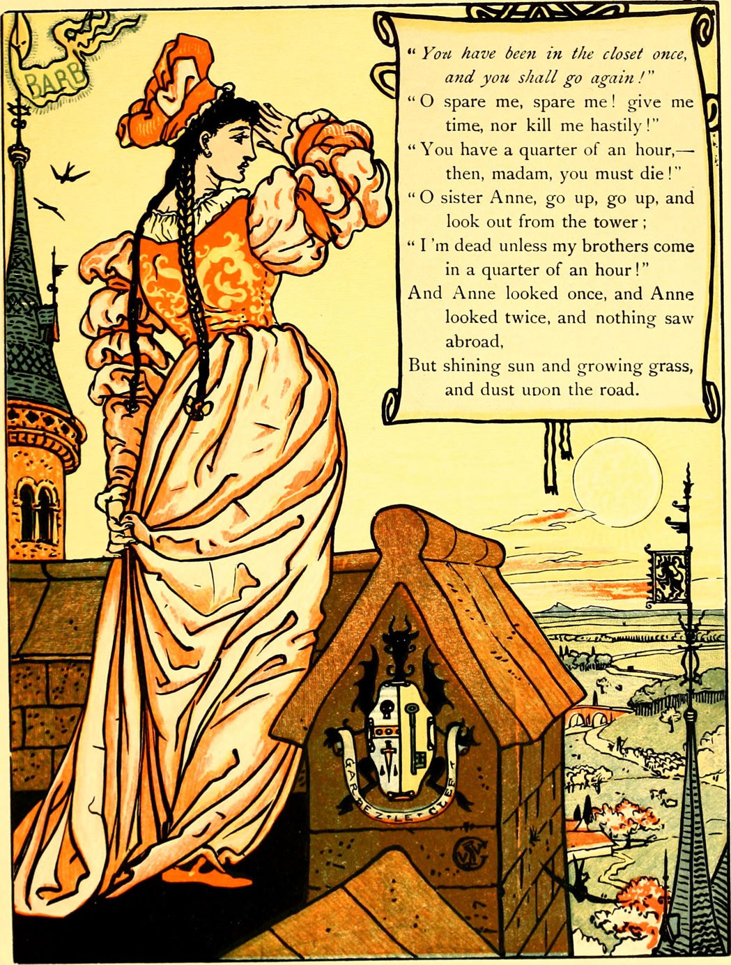 Walter Crane (1845-1915), Illustrated page for the story of Bluebeard (before 1911), in ‘The Sleeping Beauty Picture Book’, Dodd, Mead and Co., New York. Wikimedia Commons and archive.org.