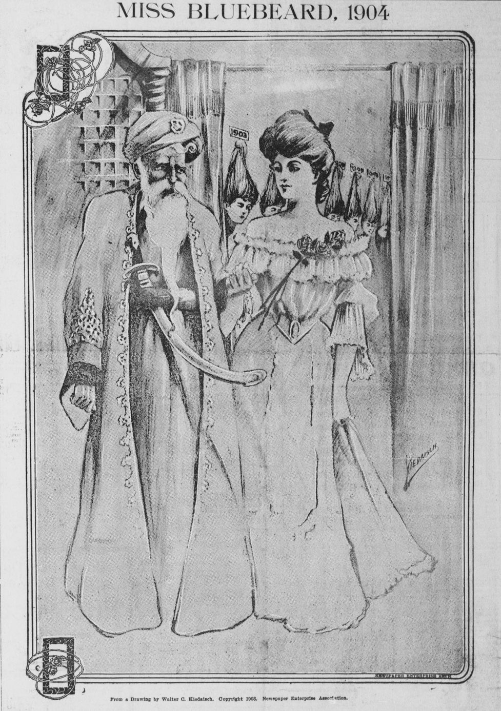 This illustration is odd for its indication that ‘Miss Bluebeard 1904’ calmly walks arm-in-arm with her murdering husband after she has seen those heads. Kiedaisch may have been referring to one of the other, changed re-tellings of the story.