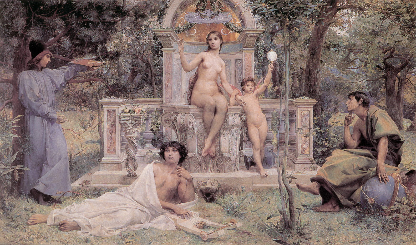 Merson was born in Paris in 1846, and studied first at the École de Dessin, then at the École des Beaux-Arts in the city. He exhibited at the Salon from 1866, and in 1869 won the prestigious Prix de Rome. He spent the next five years in Italy, returning to Paris by 1875. The Wolf of Agubbio was most probably painted from sketches and studies which he had made of the town when based in Rome.