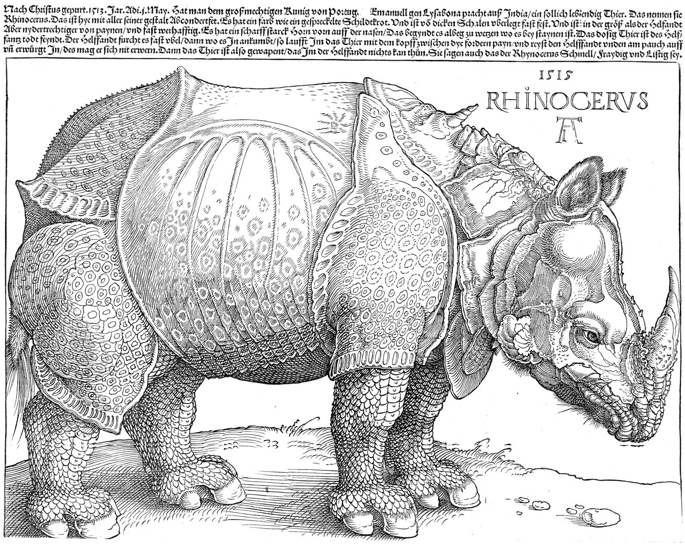 You should be getting a clearer picture when you’re shown Albrecht Dürer’s famous woodcut of The Rhinoceros from 1515. The artist never actually saw a rhinoceros, but made this woodcut from verbal descriptions recorded by others.