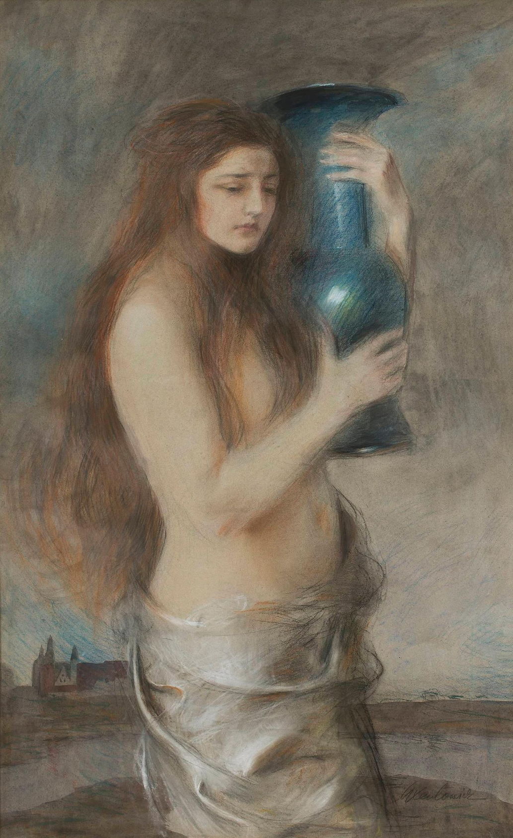 Teodor Axentowicz (1859–1938), Dziewczyna z niebieskim wazonem (Łzy) (Girl with a Blue Vase (Tears) (1900), pastel, 120 x 76 cm, Muzeum Narodowe w Warszawie, Warsaw, Poland. Wikimedia Commons.