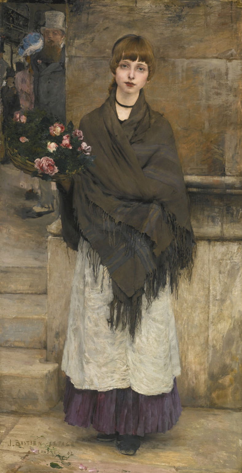 Bastien-Lepage’s portrait of a flower seller in a Flower Market in London (1882) is The Little Shepherdess of the city, posed against dull brown stonework. In the background is a reminder of how the other half lived, as an affluent man in a pale top hat walks alongside a woman wearing an exuberant blue hat.