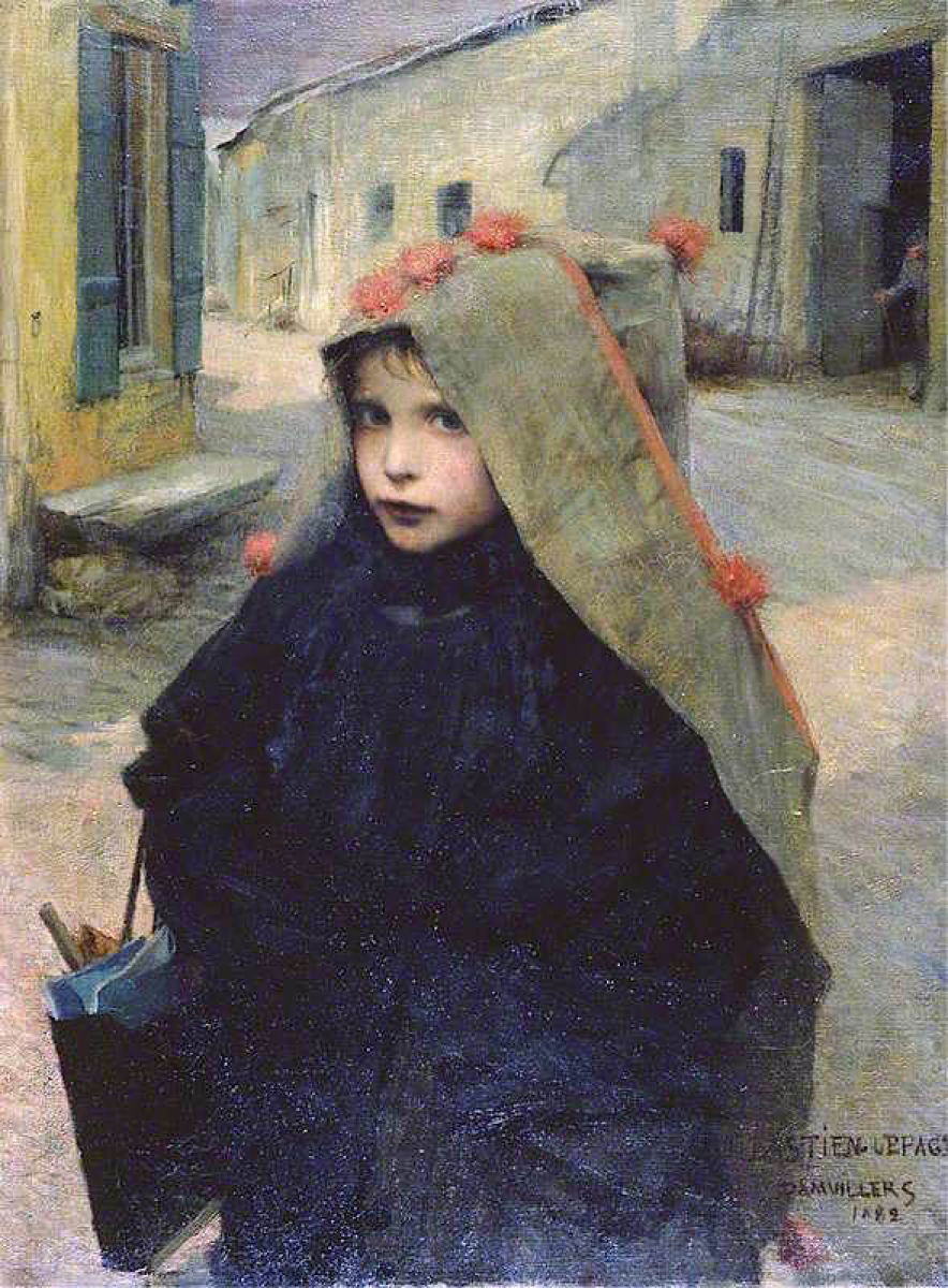 Dated in 1883, The Little Chimneysweep (Damvillers) is unusual as its subject isn’t shown standing, face-on to the viewer, but he sits and looks down at the kitten at the lower right. This young boy is also the dirtiest of Bastien-Lepage’s waifs, his left hand still being black with soot from his work. He appears to be living in a hovel, with the embers of a fire at the left edge.
