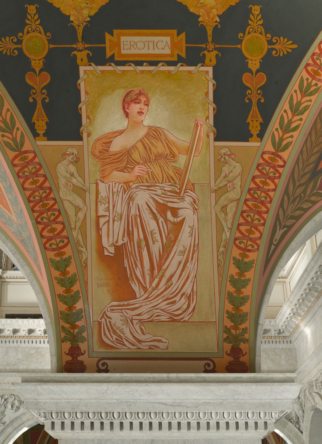 Although very little of Barse’s work is now accessible over the internet, the large wall paintings which he made in the Thomas Jefferson Building of the Library of Congress are. These were commissioned in 1895, and probably painted in the following year. The two that I show here are Romance, and Erotica (meaning love poetry rather than the modern sense of soft porn).