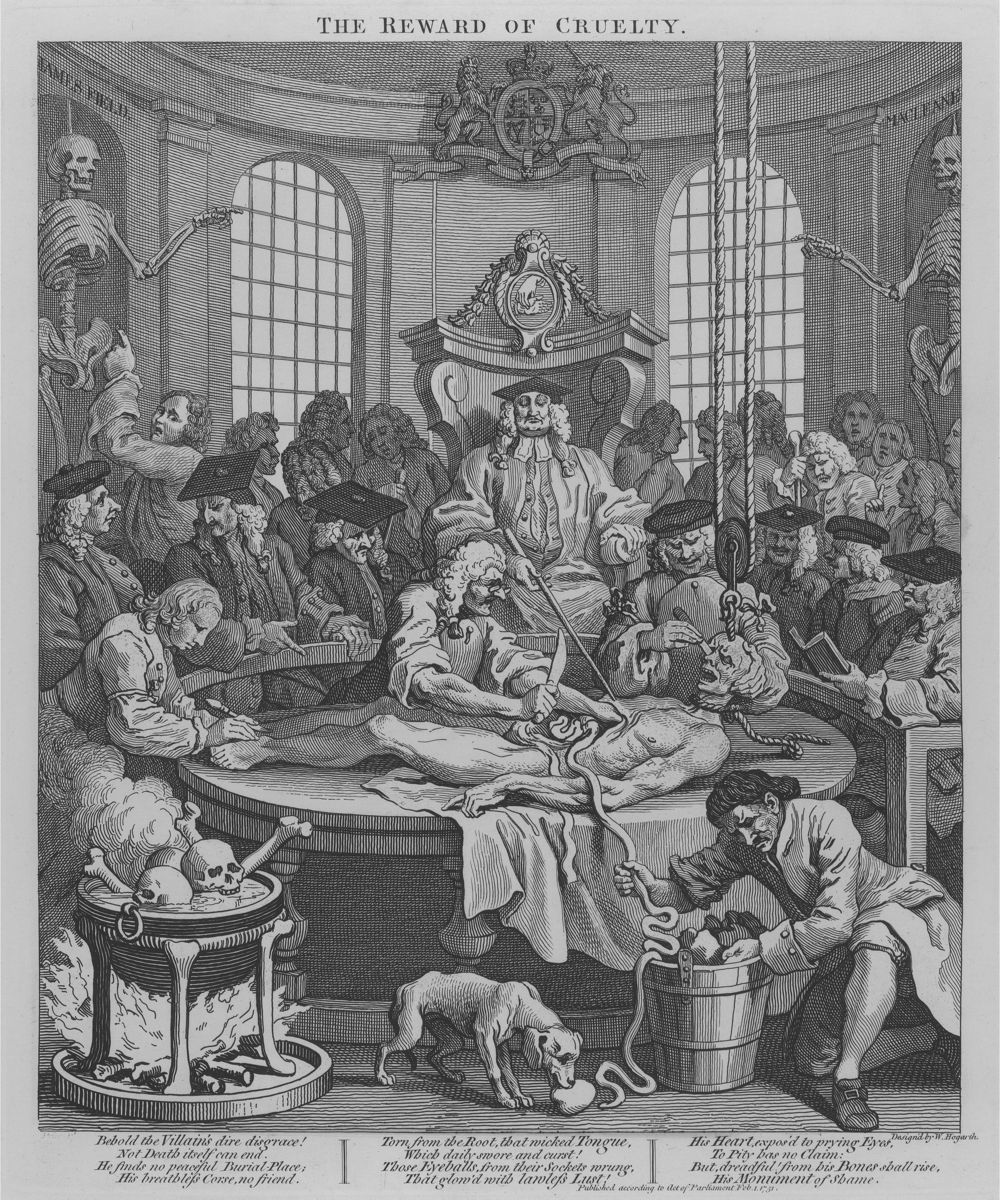 Dissection, often in public, was part of the punishment of those who were executed for crimes. They may have been dead for a few hours by then, but no effort would be spared to deprive them of the last dignity. This is shown very clearly in William Hogarth’s fourth and final stage of cruelty, from 1751.