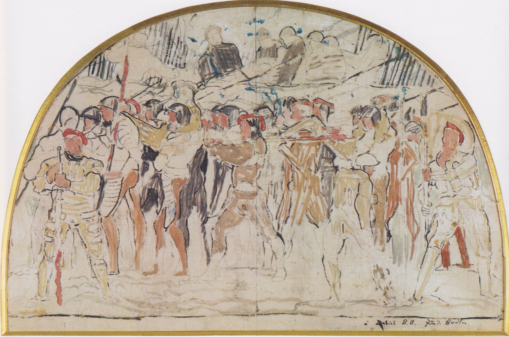 This more advanced study for the Retreat from Marignano followed soon afterwards, but Hodler’s theme, style and imagery were controversial, and the whole affair became the subject of intense public debate known at the time as the ‘fresco dispute’.