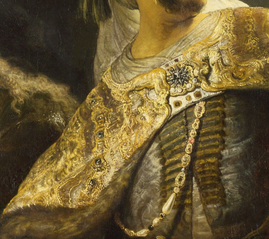 Rembrandt here used a double ground, over which he applied earth pigments before applying the uppermost layers of lighter colours, including Lead-Tin Yellow, to model the detail. These are shown in the detail below.