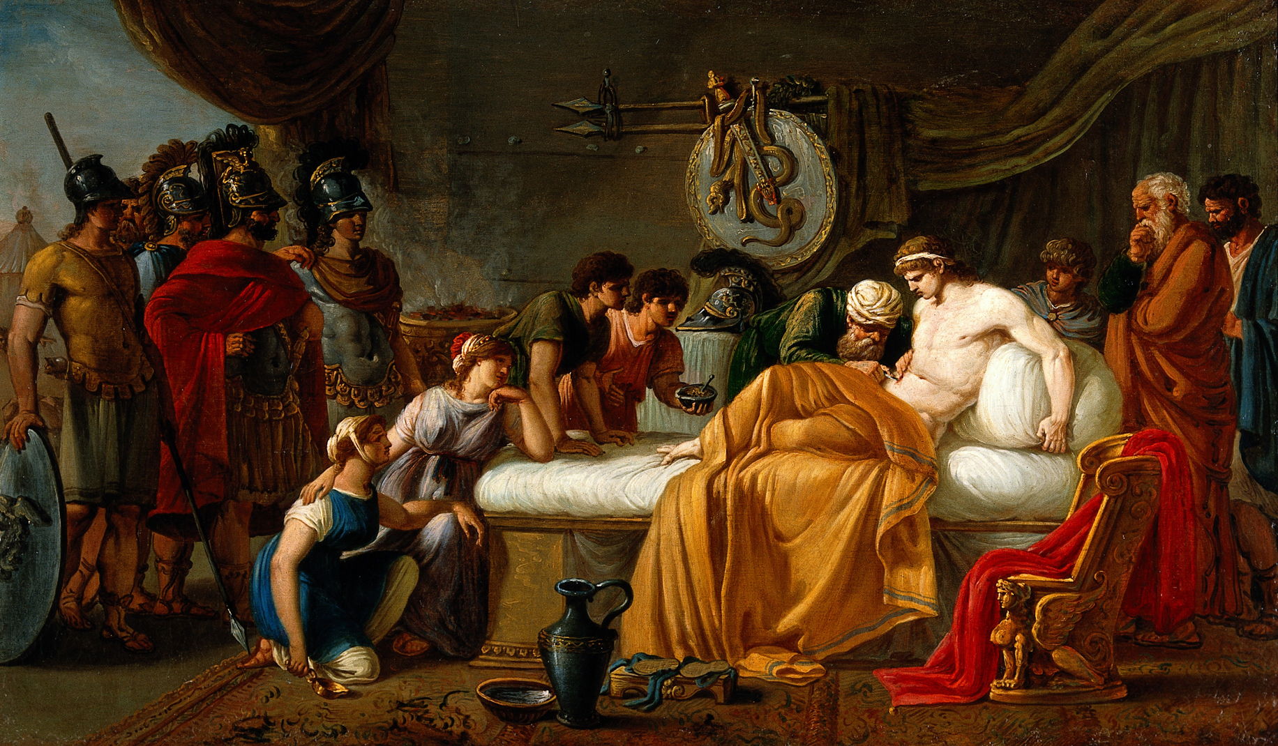 Jean-Charles Nicaise Perrin (1754–1831) (attr) or Joseph-Marie Vien (1716–1809) (school of), The Wounded Alcibiades (1743-1800), oil on canvas, 53.5 × 90.5 cm, Wellcome Library (Bequeathed by Henry Solomon Wellcome 1936), London. By courtesy of the Wellcome Library, via Wikimedia Commons.
