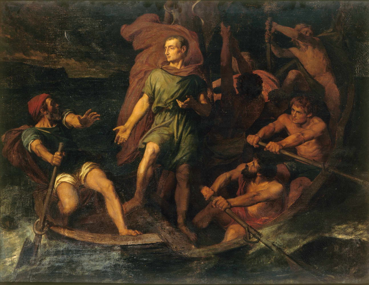 Jules-Élie Delaunay (1828-1891), Caesar and His Fortune (Caesar in the Boat) (1855), oil on canvas, 114 x 146.5 cm, Musée des Beaux-Arts de Nantes, Nantes, France. Image by VladoubidoOo, via Wikimedia Commons.