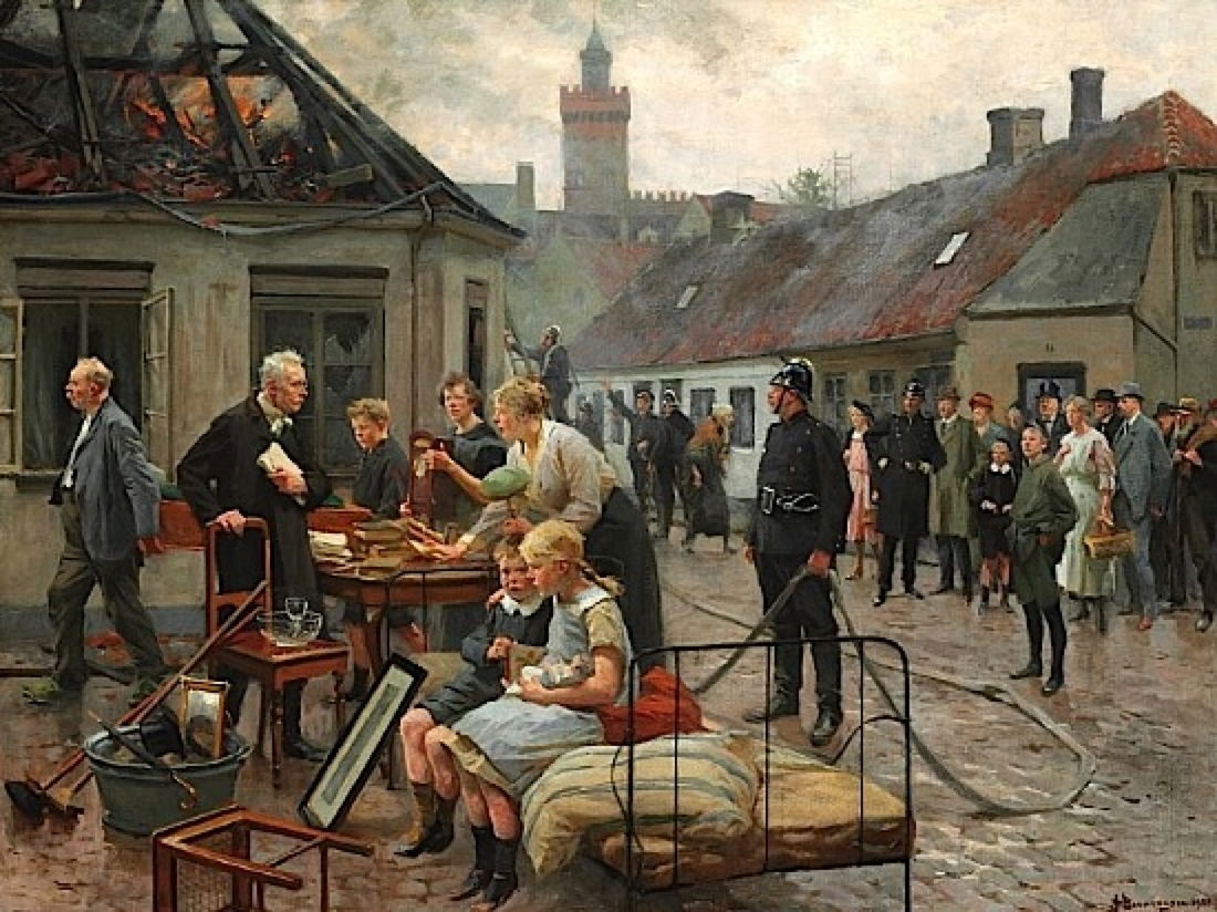 Henningsen returned to social issues in this painting of another family set out in the street with their possessions, this time the result of The Fire (1901). As firemen continue to damp down the blaze in a house, in a country town, two children comfort one another on their salvaged bed. Behind them their mother is pointing accusingly at an older, well-dressed man, who appears to be to blame for their predicament.
