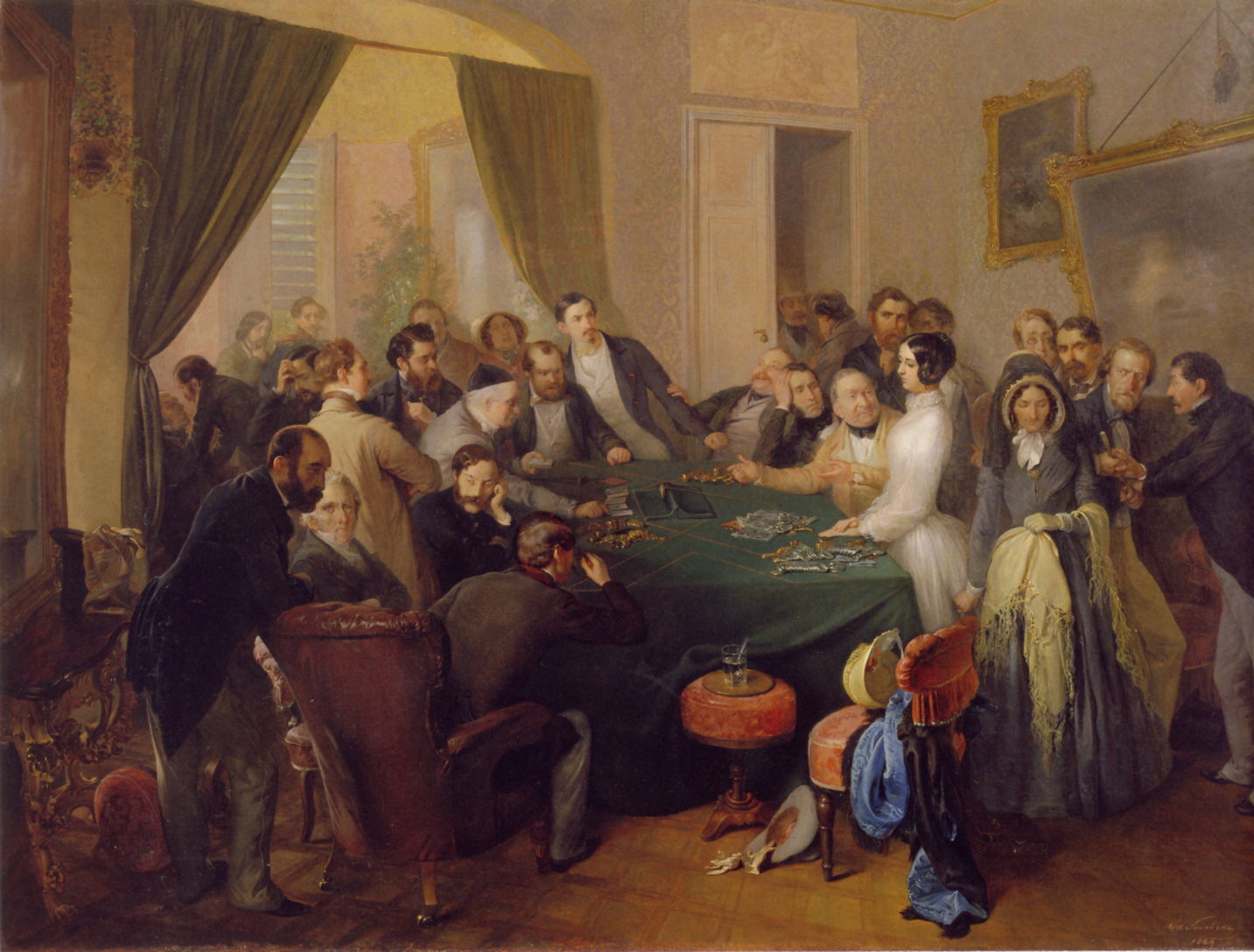 By the middle of the nineteenth century, though, some forms of gambling attracted a wider range of participants. Eduard Swoboda’s Va Banque or Gambling from 1849 shows a salon in which the card game of Pharo or Faro is being played by a group containing several women, and more respectable men too.