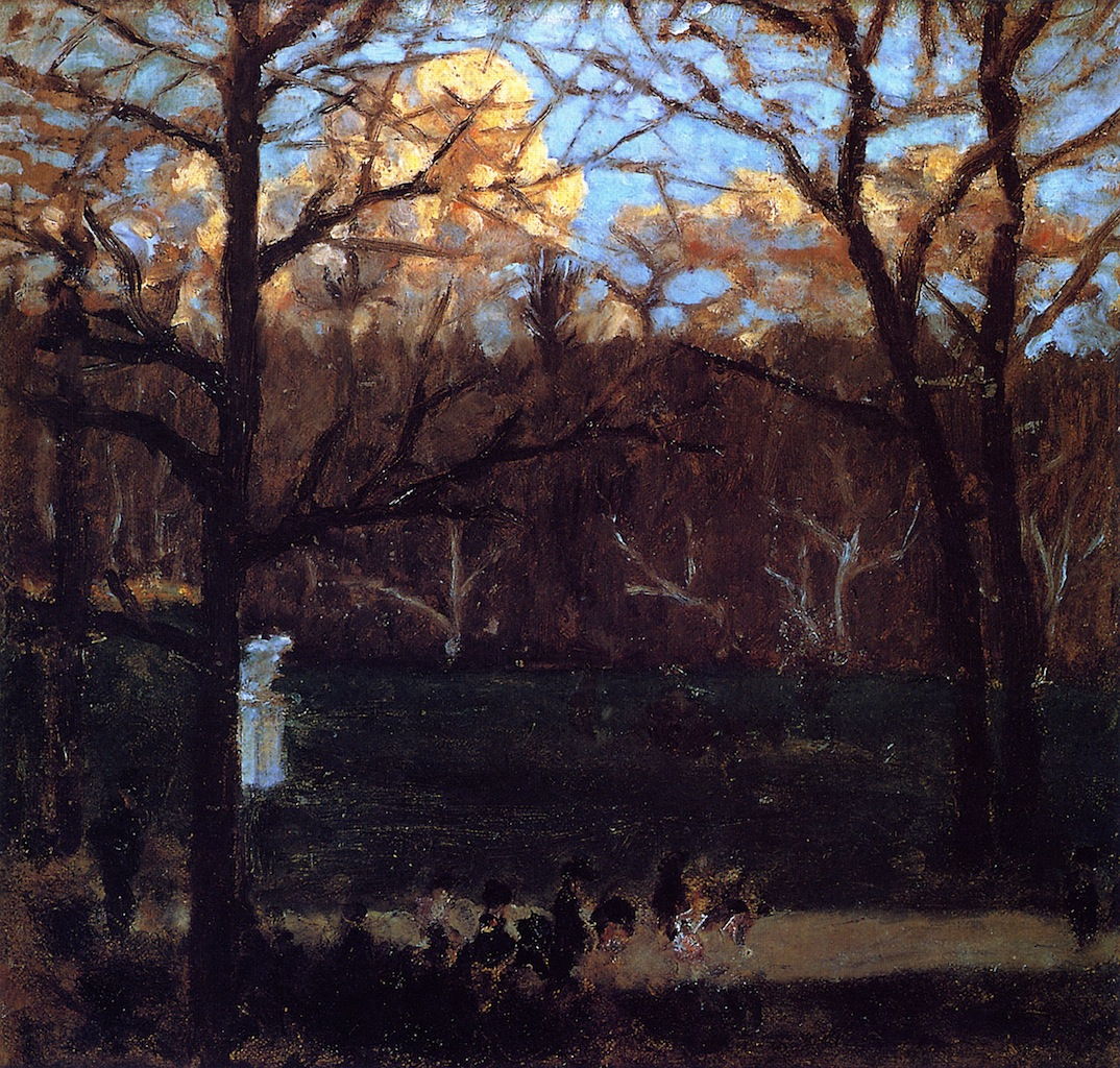 Although At the Park (1900) is not an easy painting to read – I don’t know what the prominent pale blue object at the left is – this is another of Bonnard’s explorations of high-contrast lighting. It reverses the progression more commonly seen in landscapes, with bright foreground and darker distance. Its heaped cumulus clouds are lit by wonderfully warm sunlight of a late autumn afternoon.