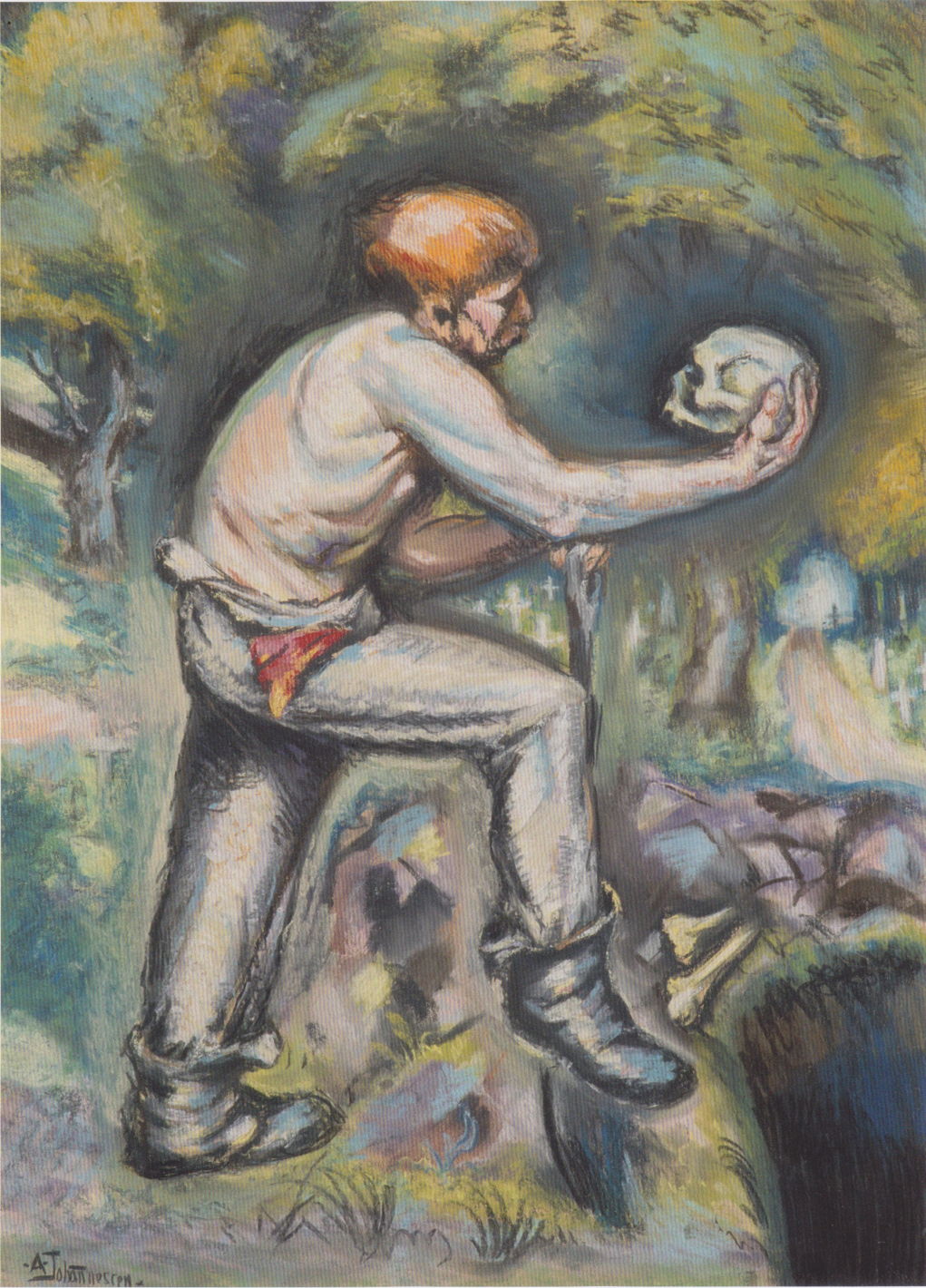 I suspect that Johannessen’s The Gravedigger (1915) was inspired, at least in part, by the famous grave-diggers scene from Hamlet, in which Hamlet laments the death of Yorick, his friend, while holding a skull. In the distance is an ethereal light which may represent a ghost or spirit.