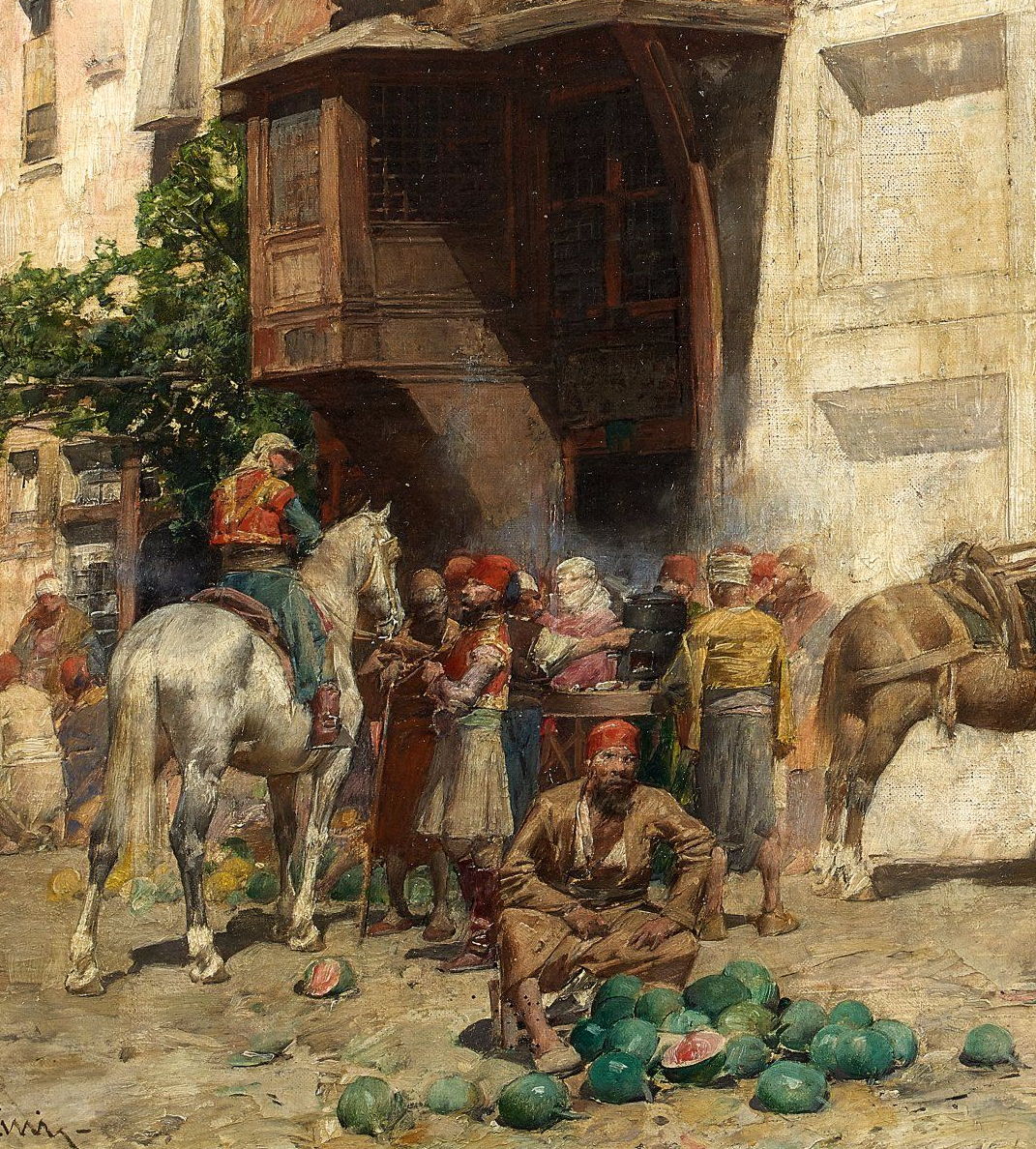 In 1882, Pasini painted this view By the Fountain, Constantinople which combines a small market – with its melon seller, of course – and three horses sheltering as well as they can from the blazing midday sun.