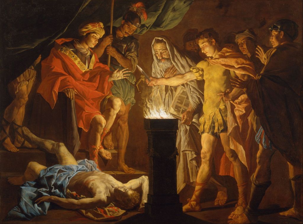 Matthias Stom’s painting of Mucius Scaevola in the Presence of Lars Porsena from about 1642 is more dramatic with its skilful use of light, with a similar composition.