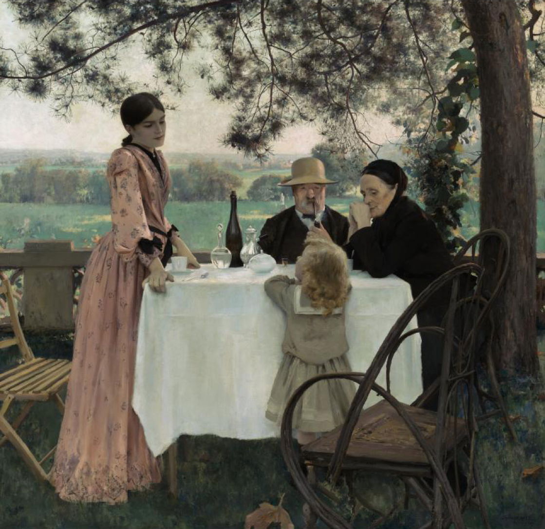 Beautiful Days (1889) was successfully exhibited at the Salon the following year, where critics compared him to the still highly popular Jules Bastien-Lepage, who had died in 1884. It shows three generations of a family together in the garden of their home: an image which was strongly supportive of the ideals of the Third Republic.