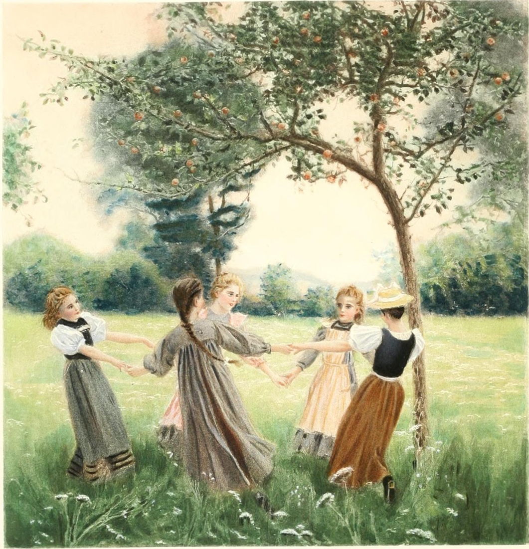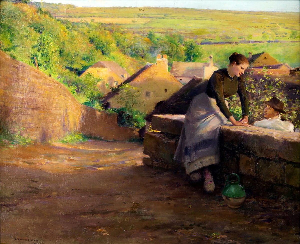 Judging by its brilliant greens, The Rustic Rendezvous is set in Spring, as a young couple talk together. She is taking a large pitcher probably to a well, and looks down on him, as he stands on the other side of a stone wall, further down the hillside. This was a popular theme among Naturalists.