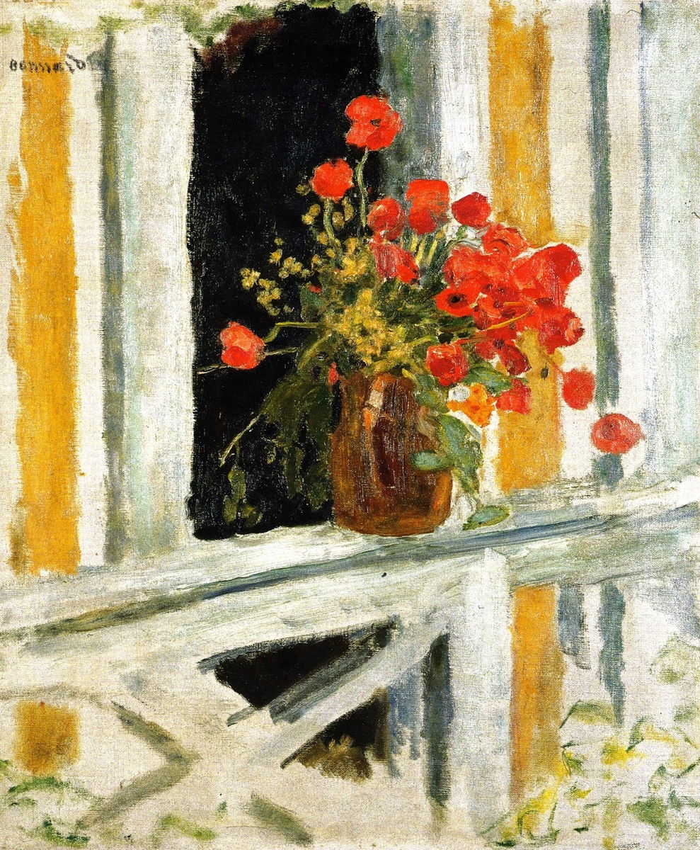 In the years preceding the First World War, Bonnard painted many still lifes, of which a large proportion were floral, including this vase of Poppies (1912) seen on a verandah. His other motifs included traditional arrangements of fruit, and laid-out tables.