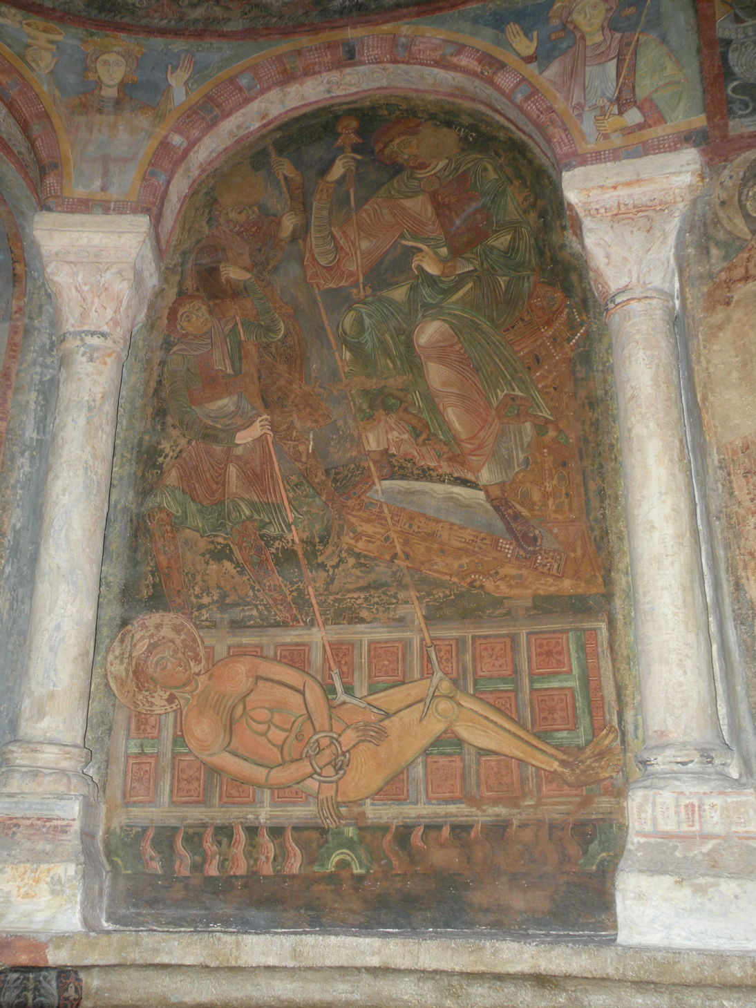 In Europe, most of the oldest examples of the use of Green Earths in substantial artworks are in frescoes, such as those in Chapelle des Moines, Berzé-la-Ville, France, which date from the 1100s. Green is one of the limited range of colours used in these depictions of the martyrdom of saints.
