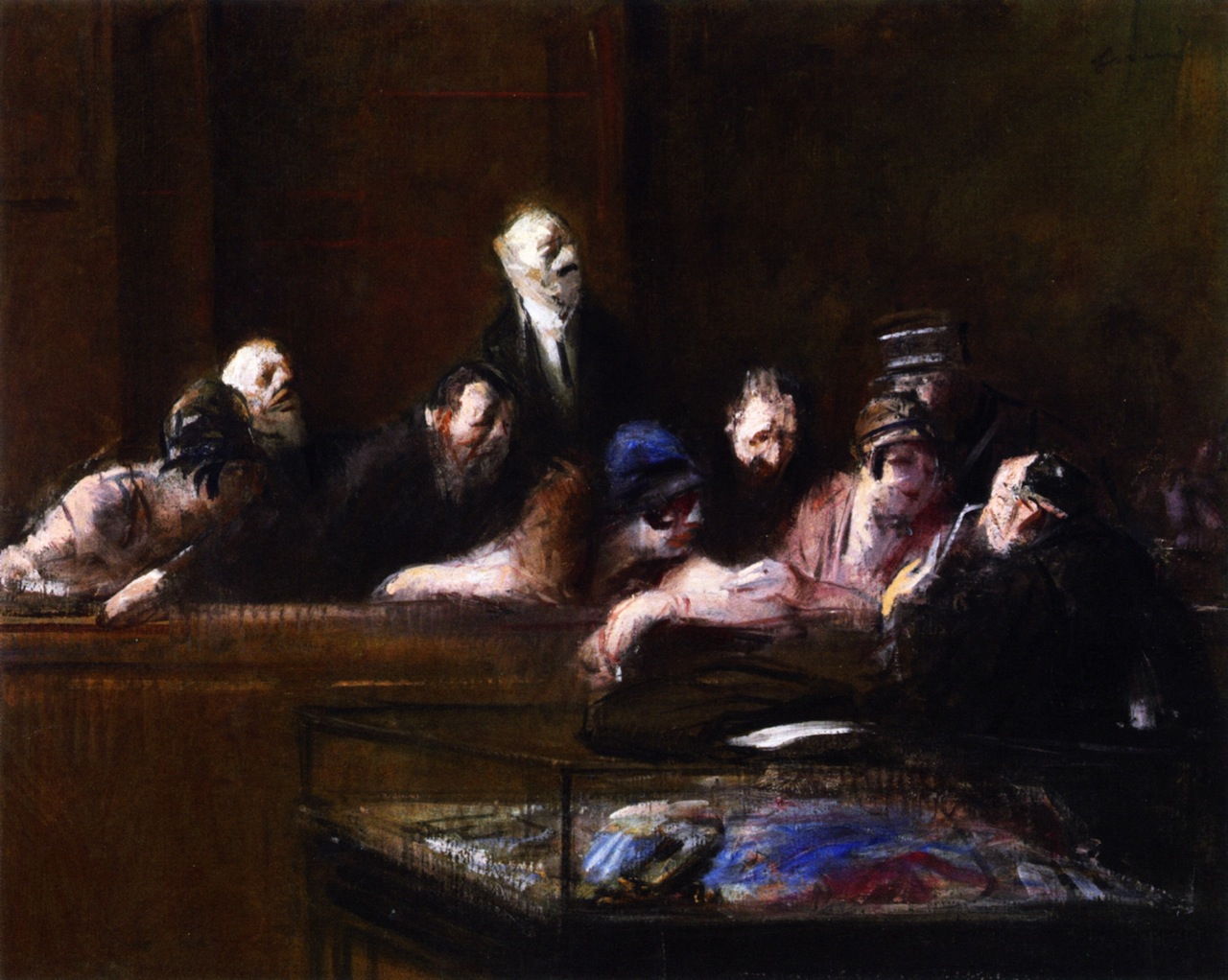 In Forain’s undated Court Scene, Exhibits, the material evidence at a trial is being presented, presumably to one of the women giving evidence.