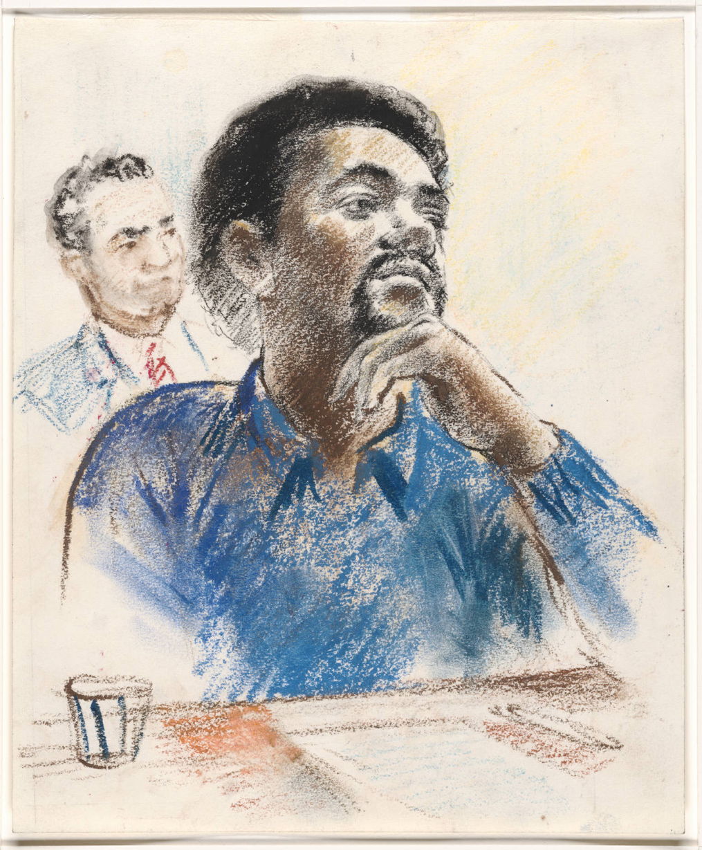 This is the image that most of the press wanted, though: a Drawing for CBS Evening News of Bobby G. Seale and others (1971) showing the head and shoulders of the accused, who co-founded the Black Panther Party for Self-Defense and was here on trial in New Haven, CT, for the murder of Alex Rackley. The jury was unable to reach a verdict and the case was declared a mistrial.