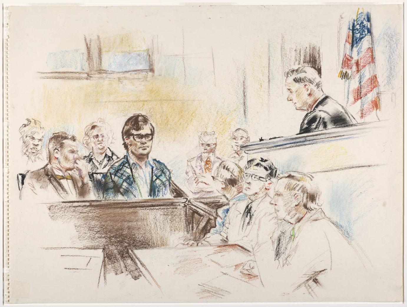 Arnold Mesches’ Courtroom sketch of the US Navy’s court of inquiry about USS Pueblo’s capture by North Korea from 1969 is perhaps more of an illustrative record of a court in session, sketched from a square and conventional position. But other artists and cases are quite different.