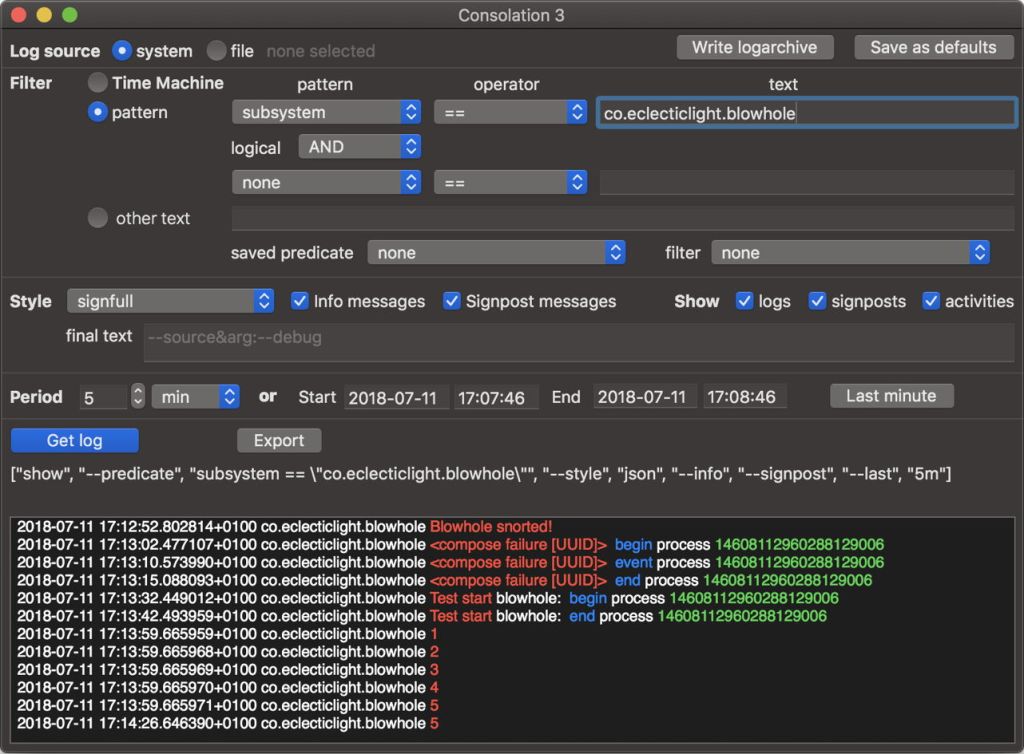All I have done in Consolation 3 is set the log extract to filter for the subsystem co.eclecticlight.blowhole, and used a style which displays the Signpost fields, which are only documented in Consolation 3 when running in Mojave: