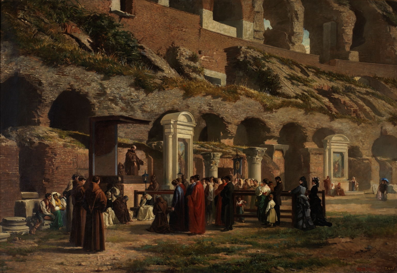 Francisco Javier Amérigo y Aparici’s Friday at the Colosseum in Rome from about 1876 shows Franciscan preaching of the Via Crucis (the Way of the Cross) taking place inside the ruins. Excavation of the substructure of the arena started in 1810, continued in 1874, then in the 1930s the whole was exposed, changing the internal appearance.