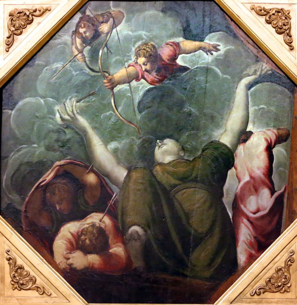 Tintoretto’s first substantial commission appears to have been for the young patrician Vettore Pisani, to decorate a room in his palace at San Paternian, near San Marco in Venice. Fourteen have survived and are now in the Galleria Estense in Modena, Italy. Painted on octagonal panels of about 130 x 130 cm, they appear to have been mounted in the ceiling, or at least towards it, and by convention their figures are viewed from below and greatly foreshortened as a result. I have been able to locate suitable images of thirteen of these, thanks to the photography of Sailko.