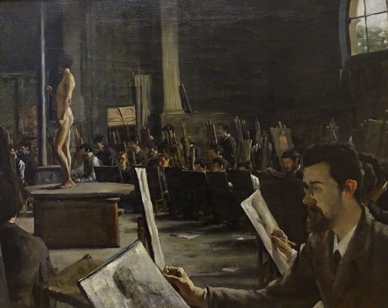 Cabanel’s reputation as an excellent and influential teacher resulted in his teaching atelier being large, and often over-subscribed. This painting by the otherwise forgotten Tancrède Baster, who was active around 1883-1890, shows Cabanel’s Studio at the École des Beaux-Arts in 1883.